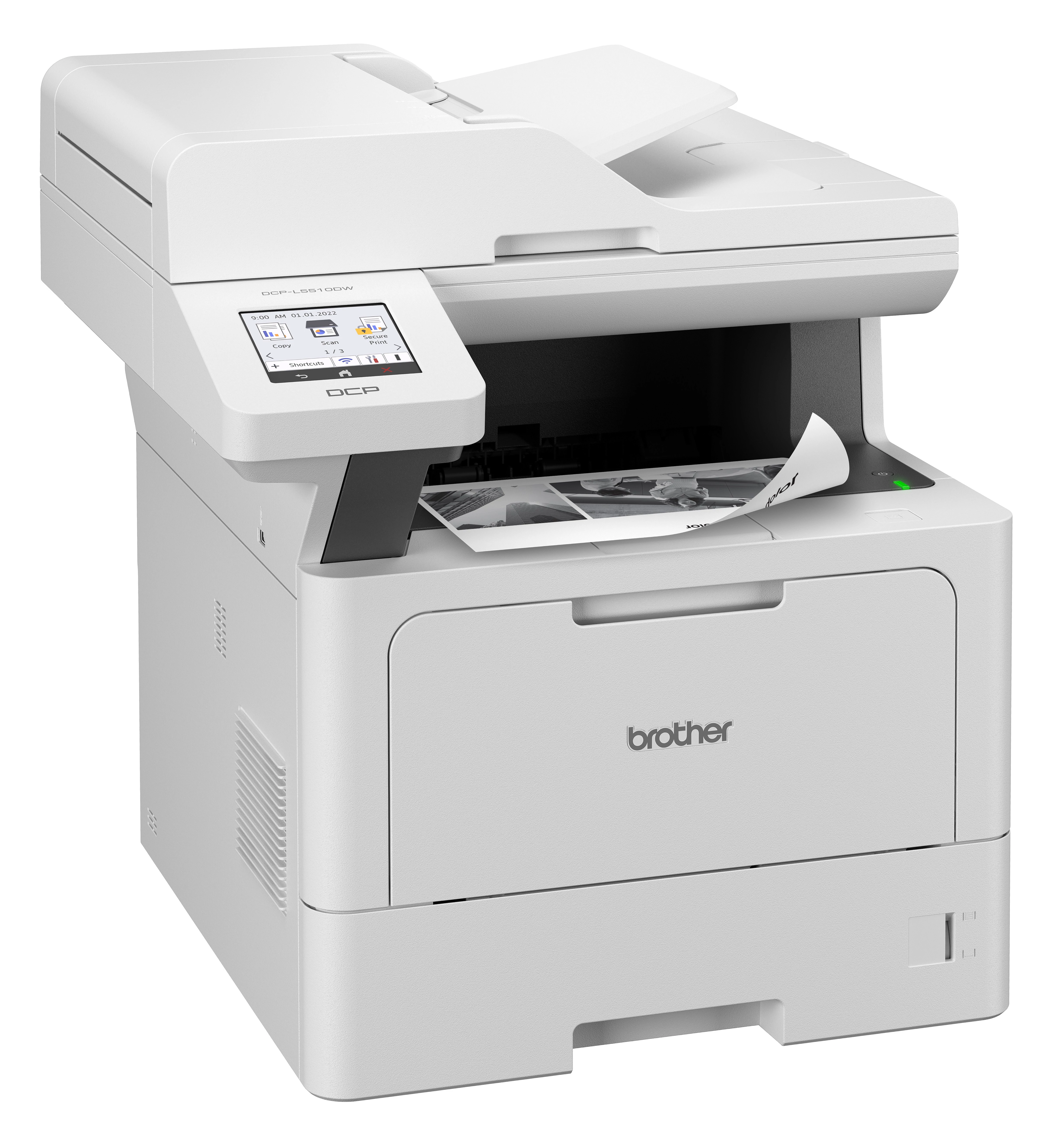 **Brother DCPL5510DW MFP** *Recept nyomtatásra ajánlott! *NAGY TELJESÍTMÉNYŰ MONO, A4, DUPLEX (csak nyomtatás), VEZETÉKES HÁLÓZATOS ÉS WIFIS MULTIFUNKCIÓS LÉZERNYOMTATÓ! *Nyomtat, másol, szkennel *50 lapos ADF *1200*1200 dpi *USB 2.0, Gigabit Ethernet, WiFi, opcionális: NFC *512 MB RAM *8,9 cm színes érintőképernyő *Nyomtatási nyelvek: PCL6, BR Script3, IBM Proprinter XL, Epson FX 850, PDF Version 1.7 *Standard 250 lapos tálca; Opcionális tálcák, maximum 2db: LT-5505 (250 lapos) és LT-6505 (520 lapos) *Induló toner: 3000 oldal *Kellékei: *DR3600 dobegység (75K) *TN3600 toner (3k) *TN3600XL toner (6K) *TN3600XXL toner (11k)