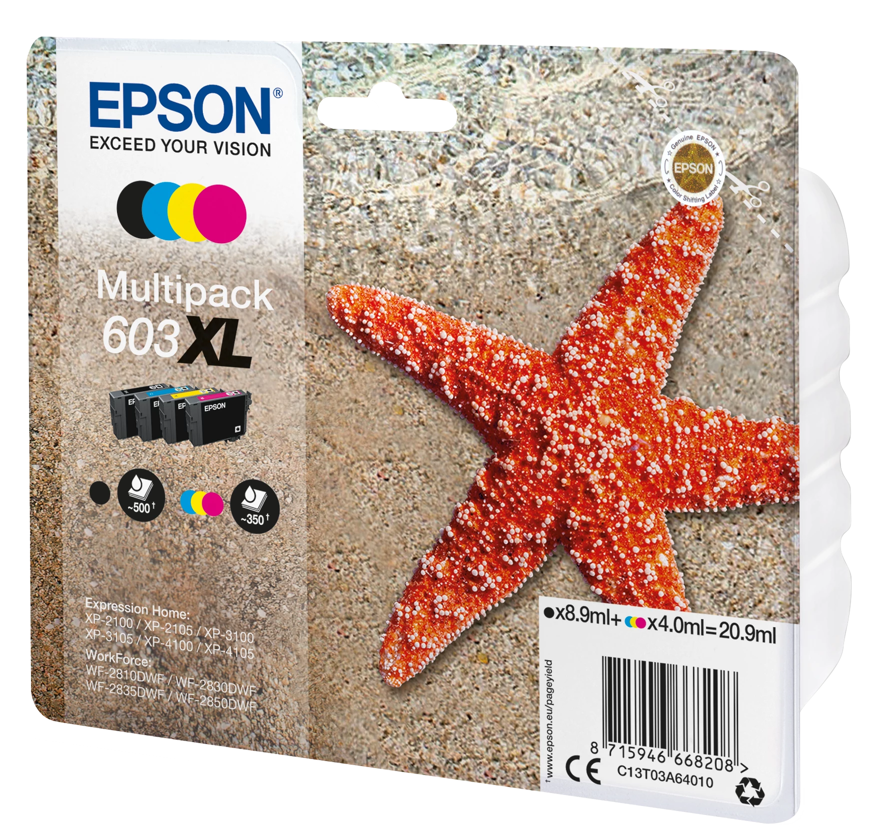 *No.603XL Multipack (Tengericsillag) *A csomag tartalma: 1x8,9ml Black, 1x4,0ml Cyan, 1x4,0ml Magenta, 1x4,0ml Yellow tintapatron *Hozzáillő alapkészülék: *Expression Home XP-2100 / XP-2105 / XP-3100 / XP-3105 / XP-4100 / XP-4105 *WorkForce WF-2810DWF / WF-2830DWF / WF-2835DWF / WF-2850DWF