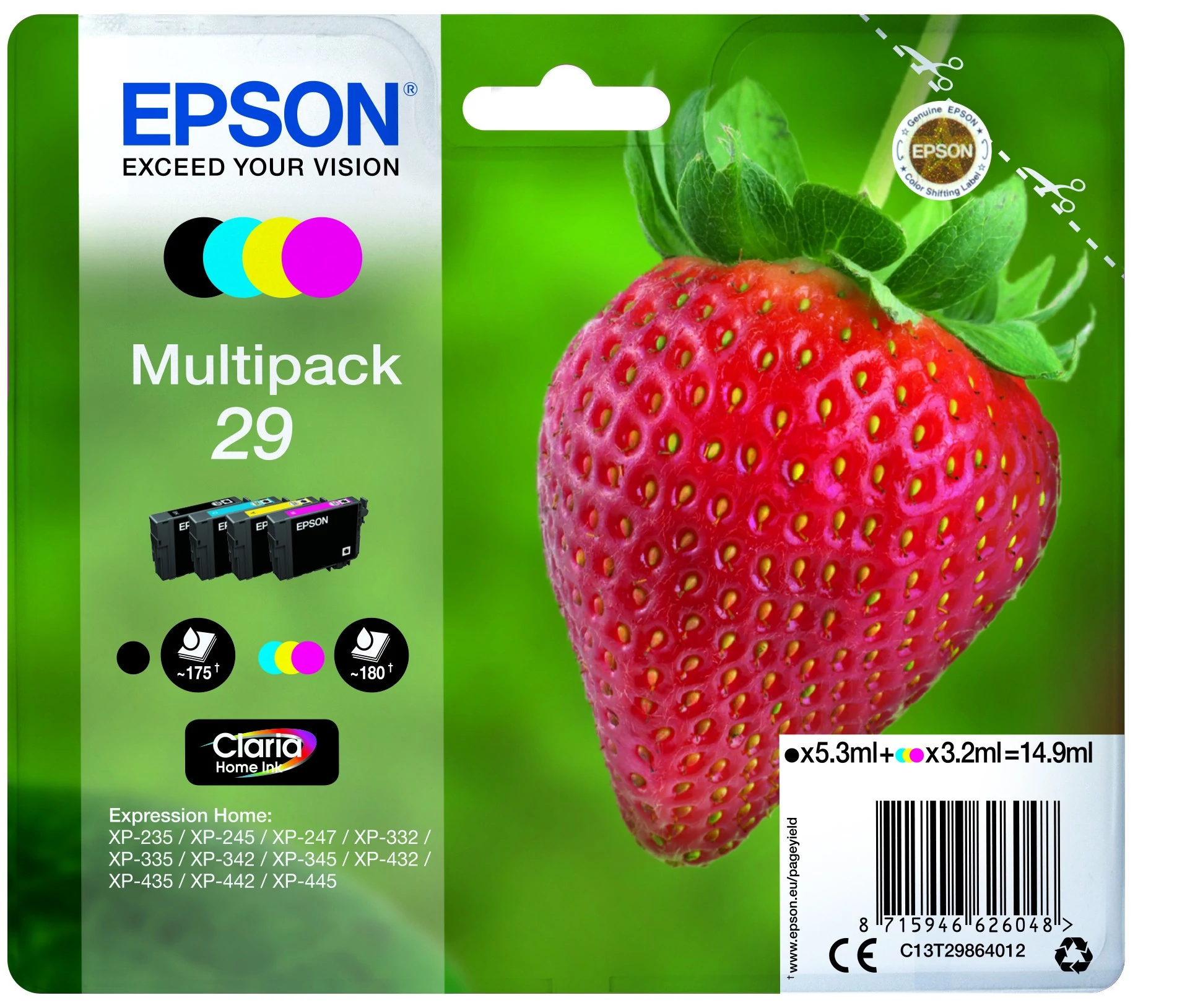 Hozzáillő alapkészülékek: *Expression Home XP-235 *Expression Home XP-245 *Expression Home XP-247 *Expression Home XP-332 *Expression Home XP-335 *Expression Home XP-342 *Expression Home XP-345 *Expression Home XP-432 *Expression Home XP-435 *Expression Home XP-442 *Expression Home XP-445 *A csomag tartalma: 1 x 3.2 ml Cyan, 1 x 3.2 ml Magenta, 1 x 5.3 ml Black, 1 x 3.2 ml Yellow